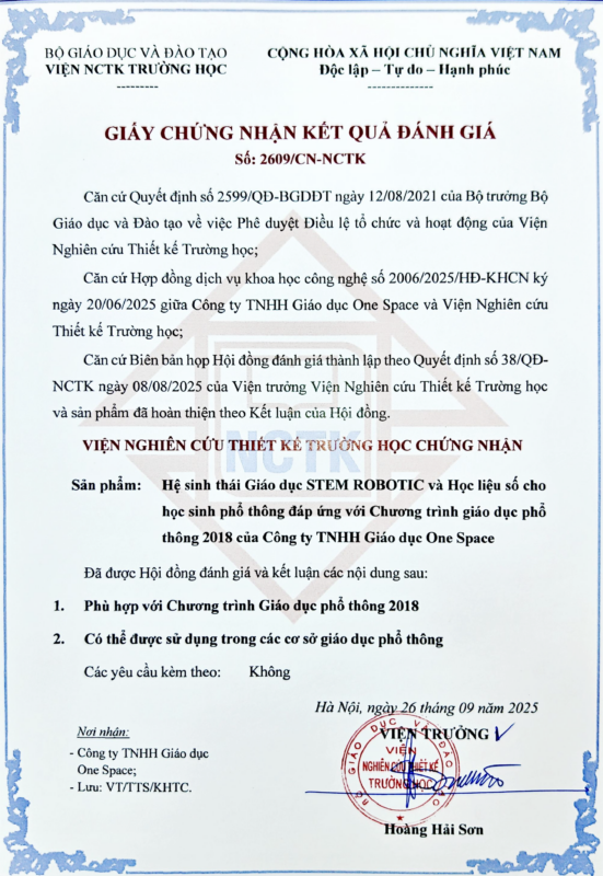 Song song với thành tựu quốc tế, OneSpace tự hào được Viện Nghiên cứu Thiết kế Trường học (trực thuộc Bộ Giáo dục & Đào tạo) cấp Giấy chứng nhận kết quả đánh giá số 2609/CN-NCTK vào ngày 26/09/2025.